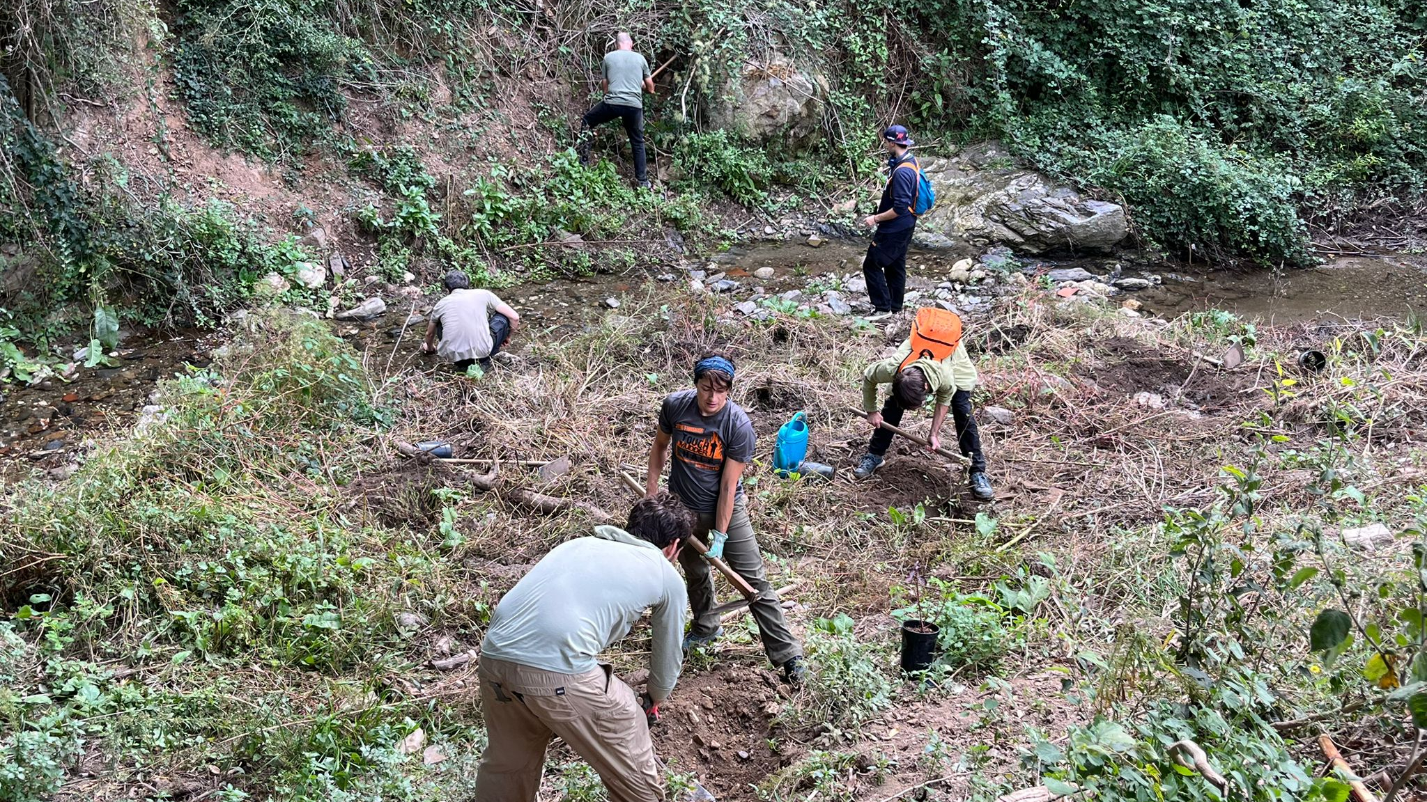 Al final de la sortida es va realitzar una petita plantació d’arbusts de ribera en un tram en què s’ha eliminat un dens canyar i s’ha posat una coberta plàstica experimental per procurar que no pugui rebrotar de nou, atès que el fort pendent del terreny desaconsellava actuar amb maquinària per eliminar-ne el rizoma.