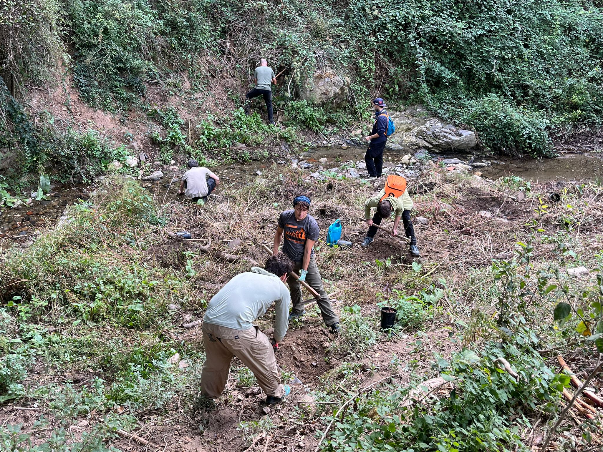 Al final de la sortida es va realitzar una petita plantació d’arbusts de ribera en un tram en què s’ha eliminat un dens canyar i s’ha posat una coberta plàstica experimental per procurar que no pugui rebrotar de nou, atès que el fort pendent del terreny desaconsellava actuar amb maquinària per eliminar-ne el rizoma.