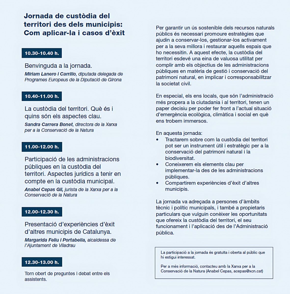 Jornada tècnica adreçada a persones d’àmbits tècnic i polític municipals, i també a propietaris particulars que vulguin conèixer les oportunitats que ofereix la custòdia del territori, el seu funcionament i l’aplicació des de l’Administració pública.