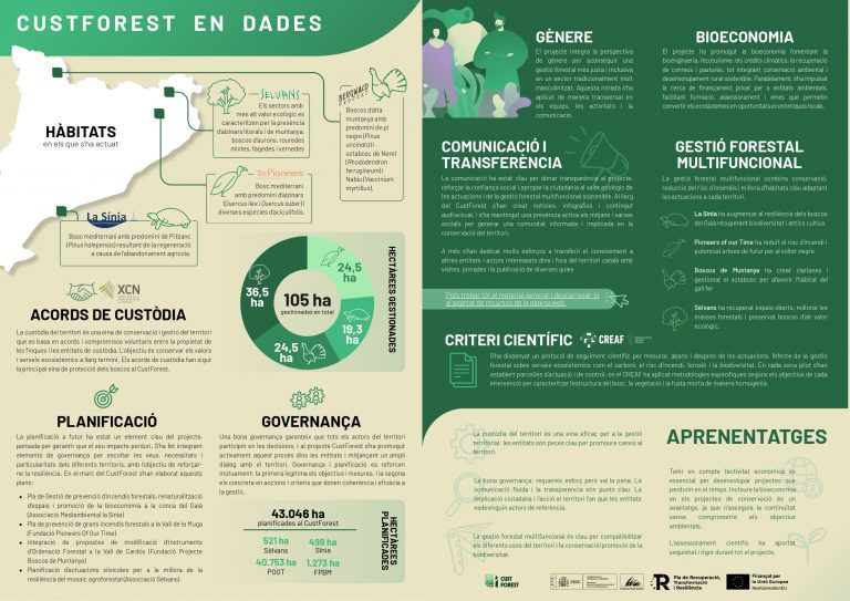 Durant la jornada final del projecte CustForest, celebrada el 20 de novembre a la Universitat Autònoma de Barcelona, s’han presentat els resultats i els aprenentatges dels dos anys de treball del projecte, que ha buscat demostrar que conservar la natura i dinamitzar l’economia rural no eren objectius oposats, sinó complementaris. Coordinat per la Xarxa per a la Conservació de la Natura juntament amb el CREAF, CustForest ha comptat amb la participació de quatre entitats arrelades al territori: la Fundació Pioneers of Our Time a la Vall de la Muga, l’Associació Sèlvans a la Garrotxa, l’Alt Empordà i el Ripollès, i la Fundació Projecte Bosco Sínia a la conca del riu Gaià.